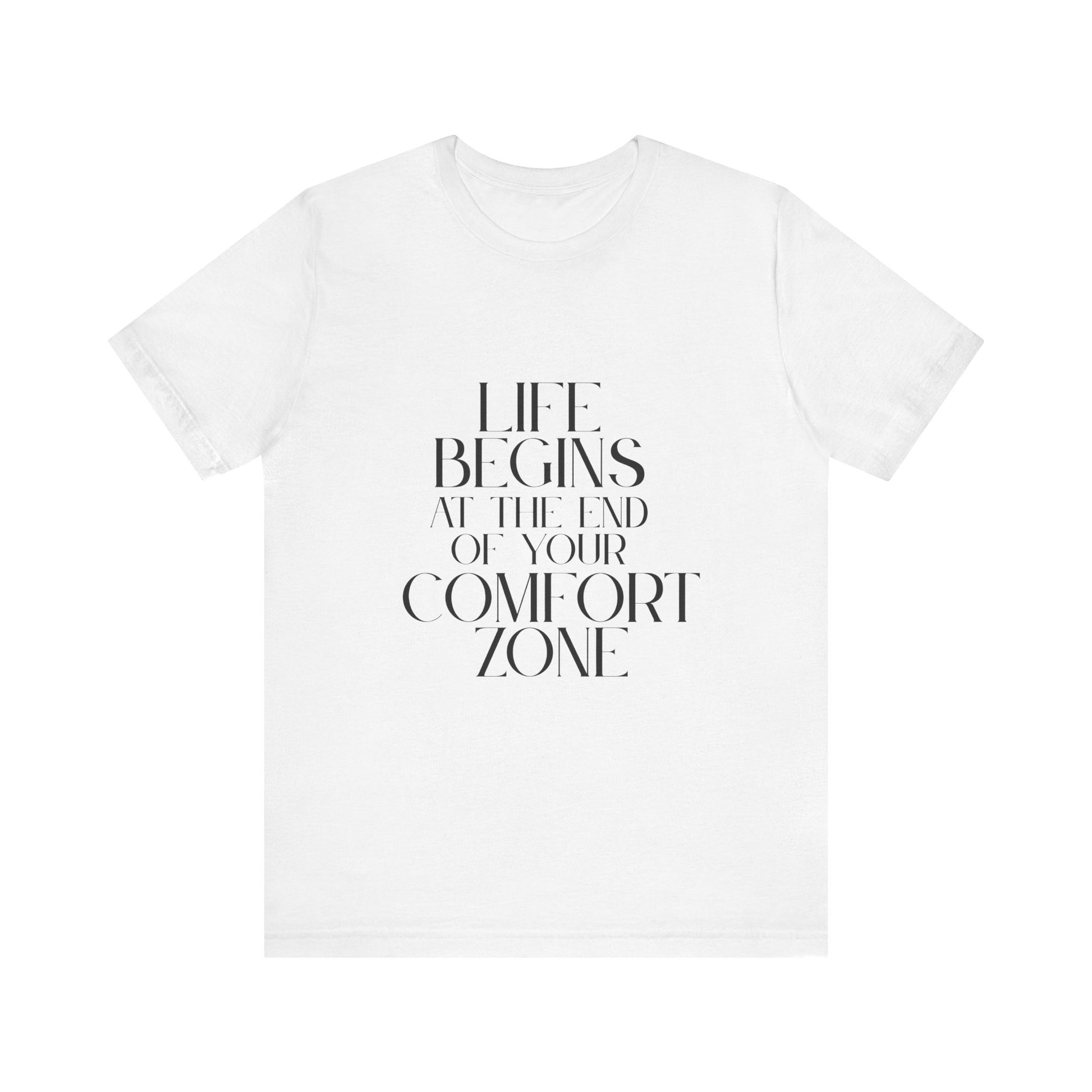 A motivational slogan tee that encourages you to step out of your comfort zone and embrace new experiences. Perfect for those seeking inspiration and looking to add a positive message to their wardrobe. Ideal for casual wear and can be styled for various occasions.