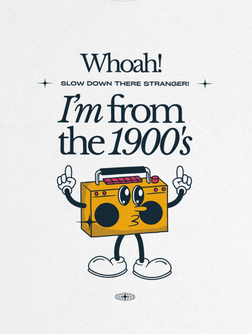 Take a nostalgic trip back in time with our "Slow Down - I'm From the 1900s!" t-shirt. This vintage-inspired heavyweight cotton tee features a charming retro design with a quirky boombox character that celebrates simpler times. Perfect for those who remember life before streaming and digital music, this conversation starter blends humor with classic comfort.
